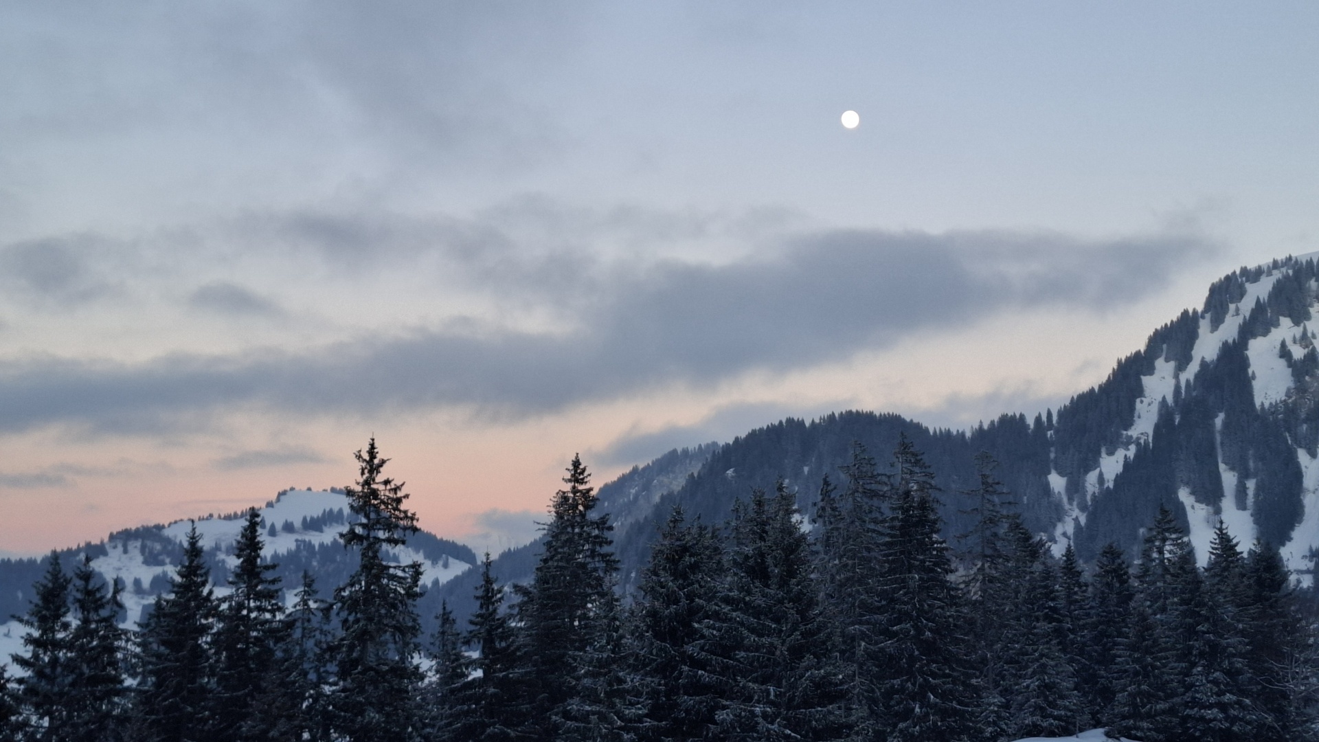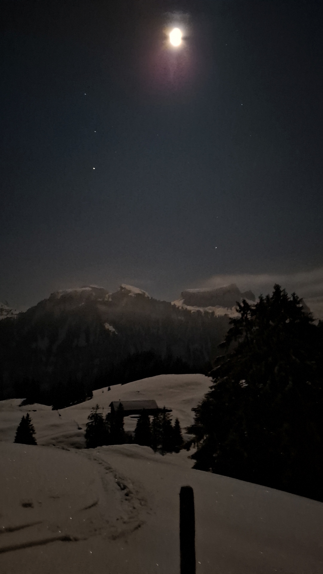 Traumhafter Mond am wolkenlosen Himmel, Schneeverhältnisse knapp, Schlittelweg und Piste gut befahrbar